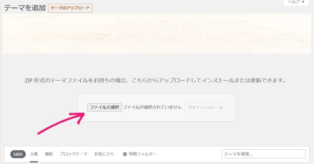 テーマのアップロードを1クリックすると手順1と違いファイル選択のタブが表示されます。