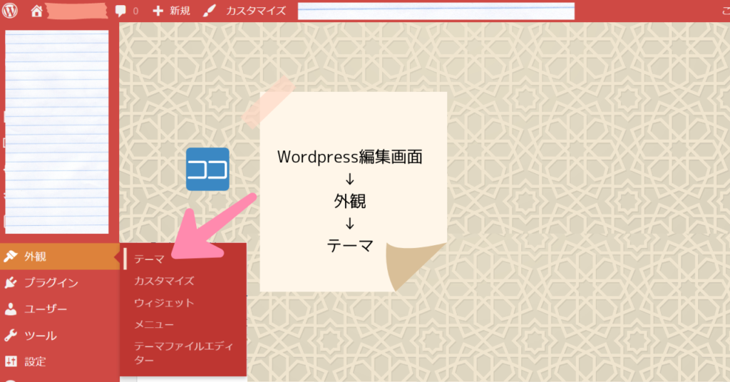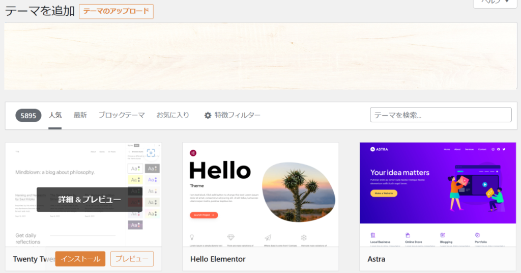 無料テーマに多いワードプレス設定画面から直接インストールができる方法です。